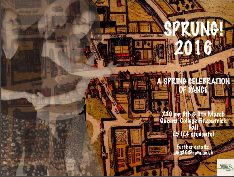 £5 (£4 students)Sprung! is a self selecting forum for dancers and choreographers of all levels, giving them a rare and wonderful performance opportunity taking pride in celebrating the rich diversity and creativity of dance at Queens’, bringing together students, professionals, guest artists, choreographers, composers and musicians to work in exciting, eclectic and unexpected ways.