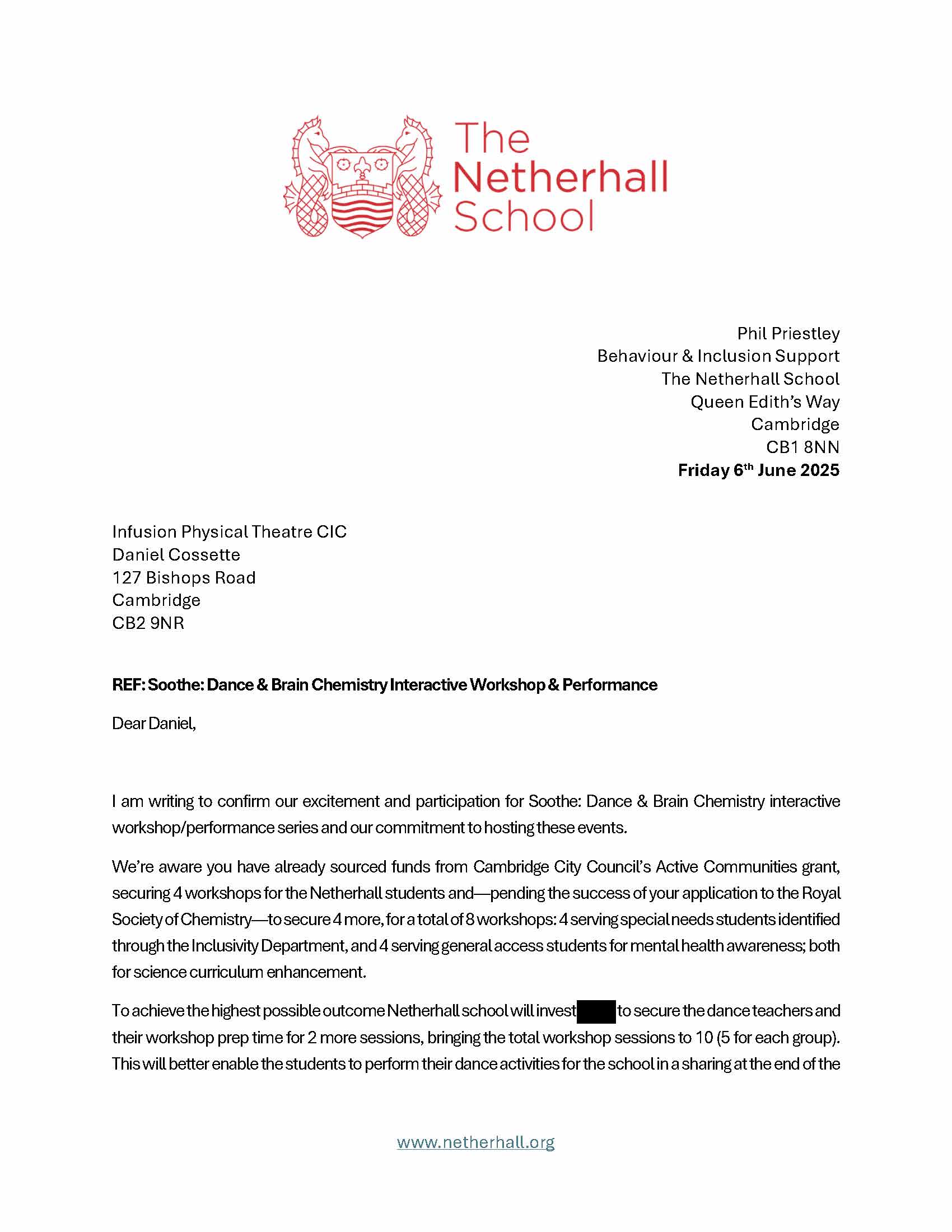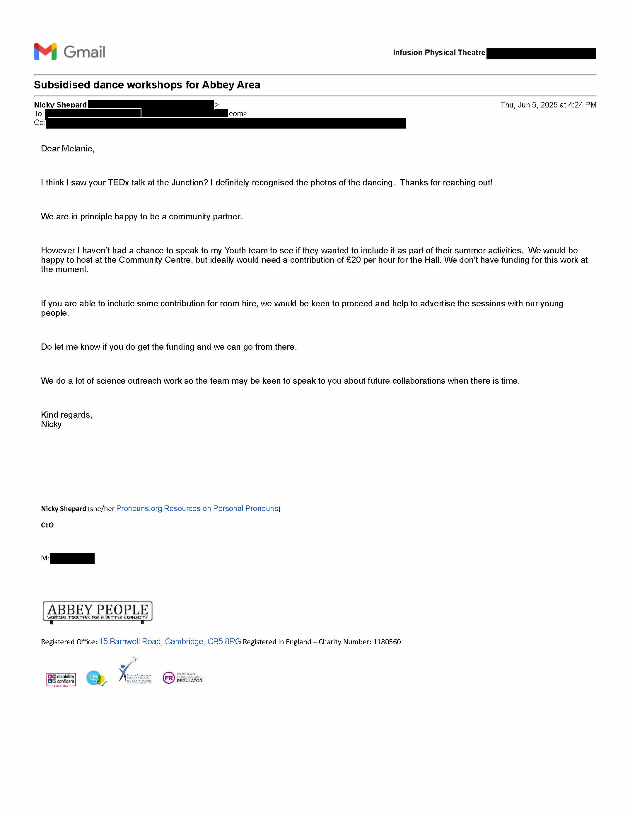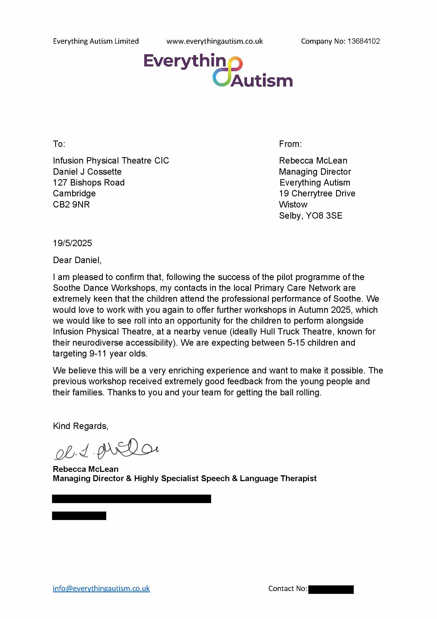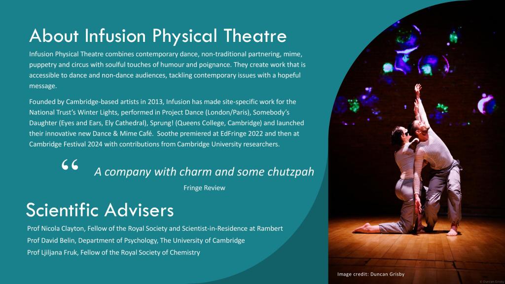 These are letters of support from partners and organizations who are current and future collaborators with Infusion Physical Theatre on this project.