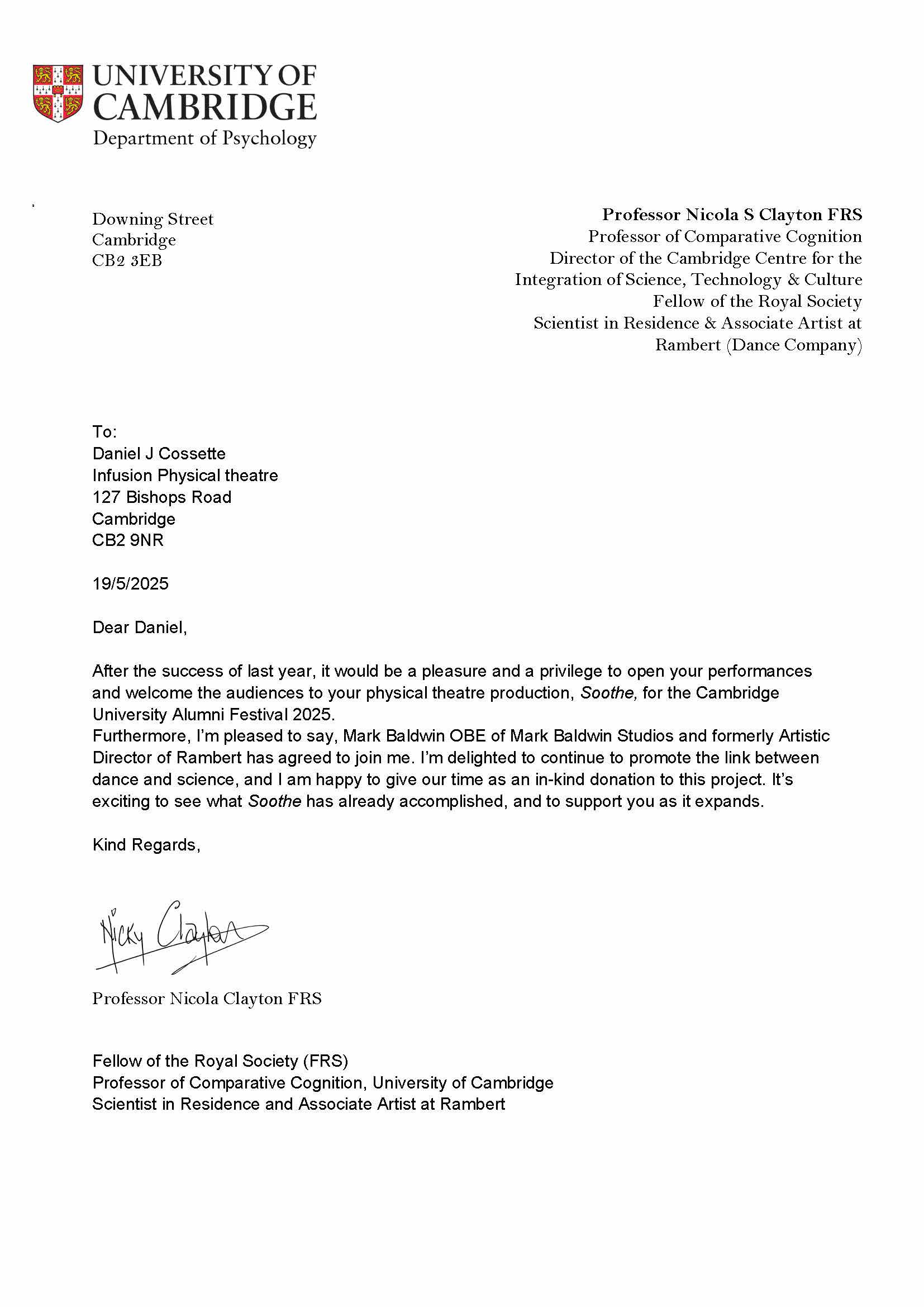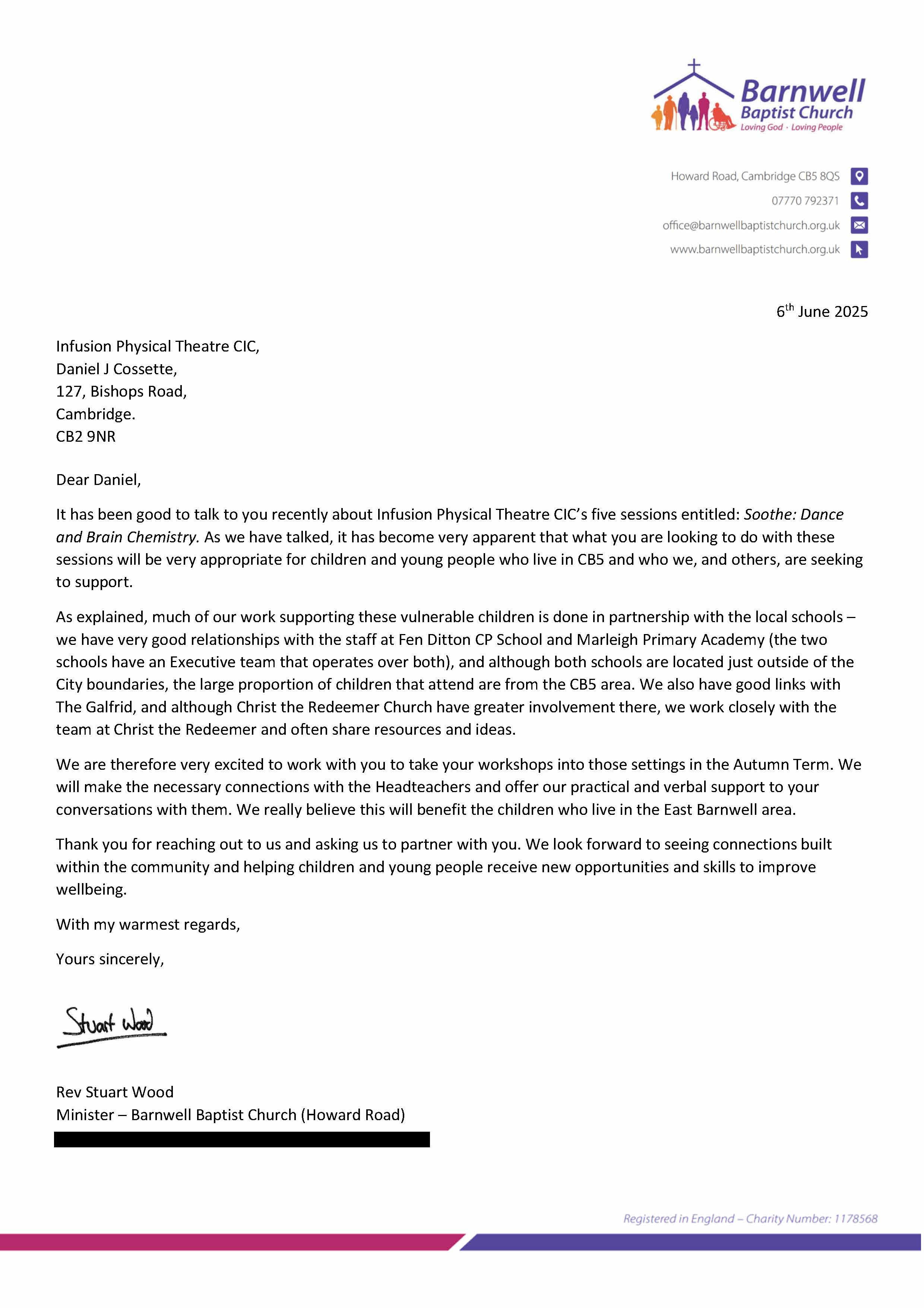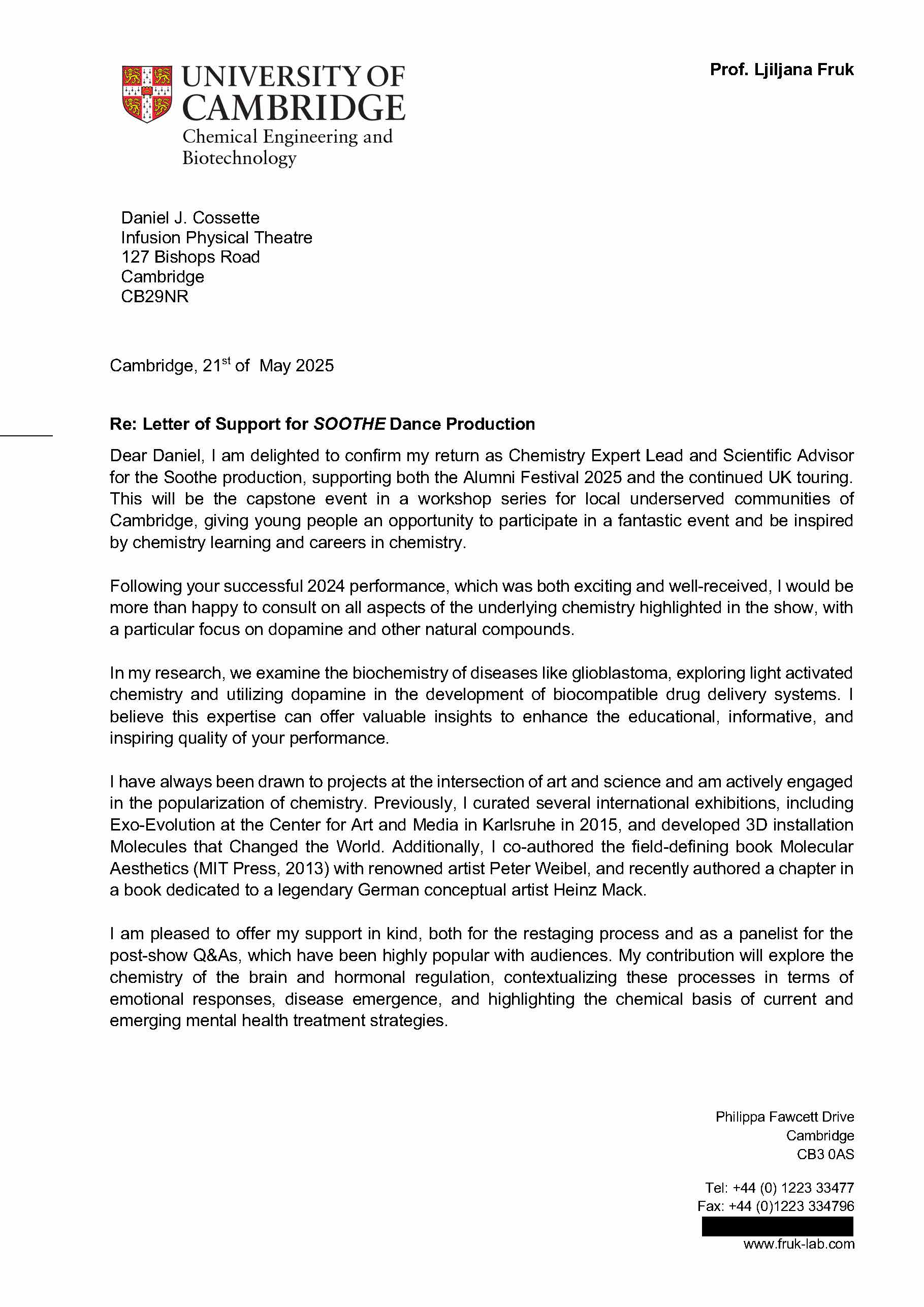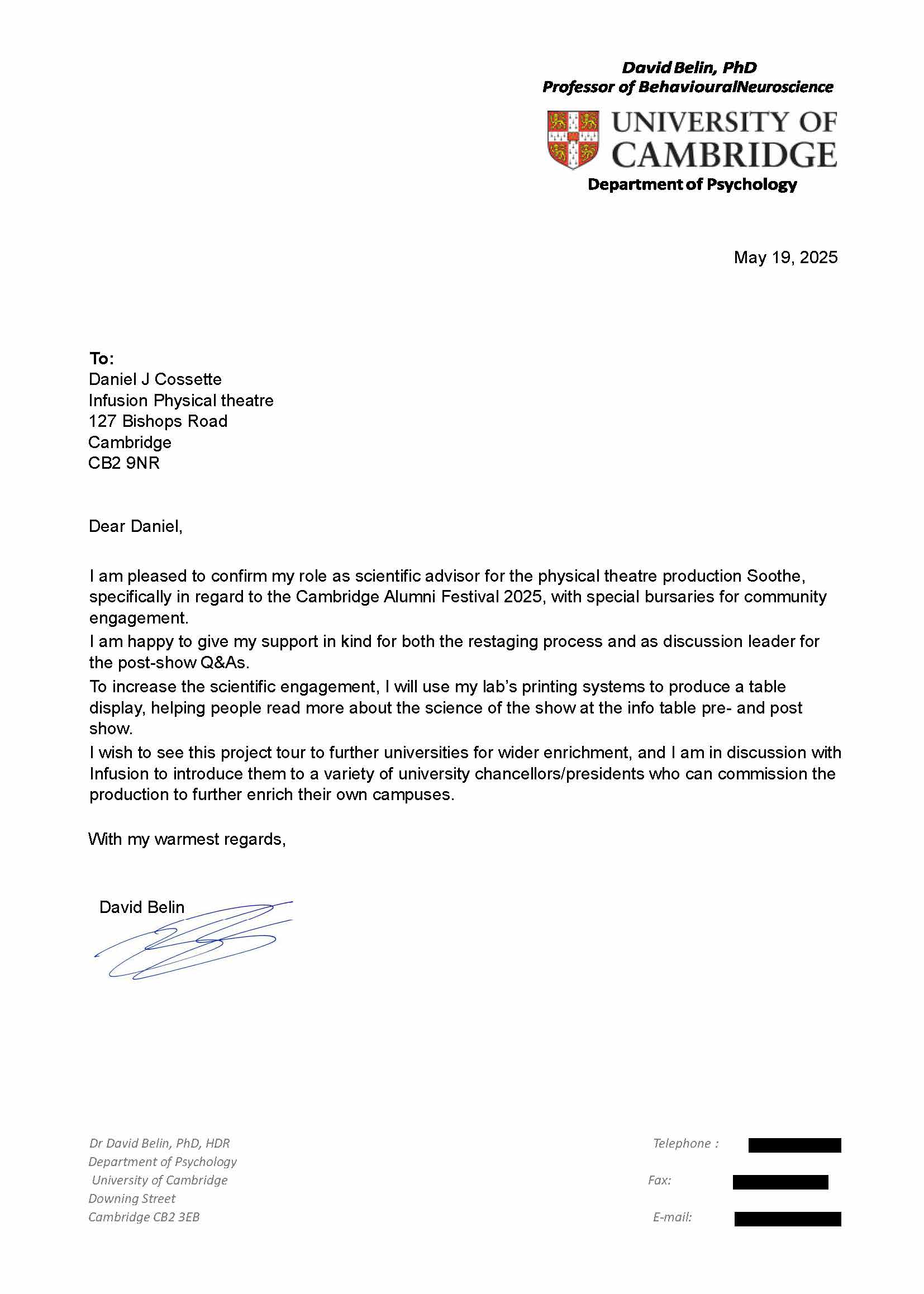These are letters of support from partners and organizations who are current and future collaborators with Infusion Physical Theatre on this project.